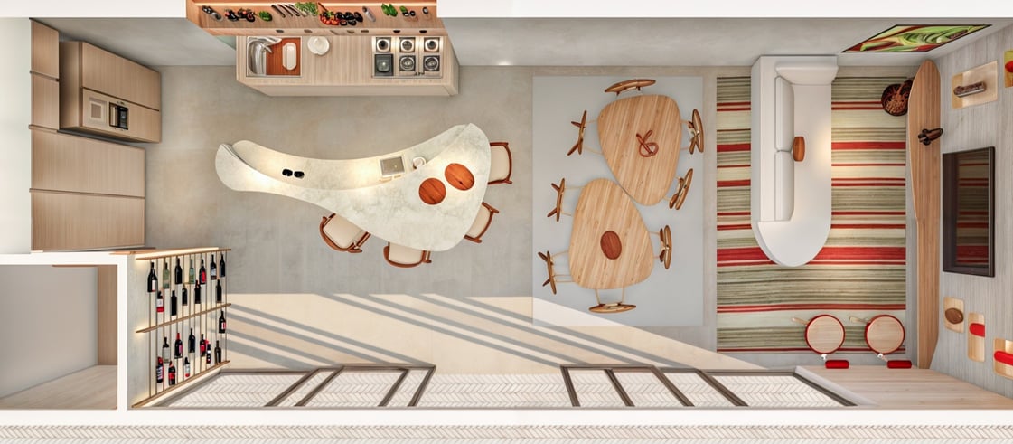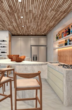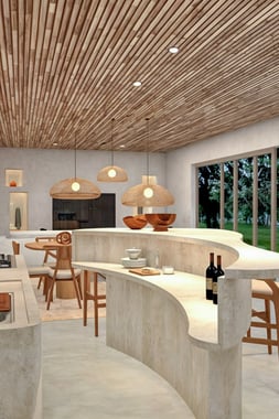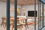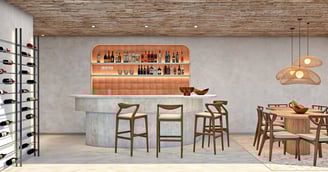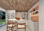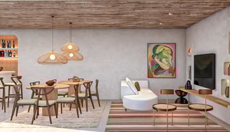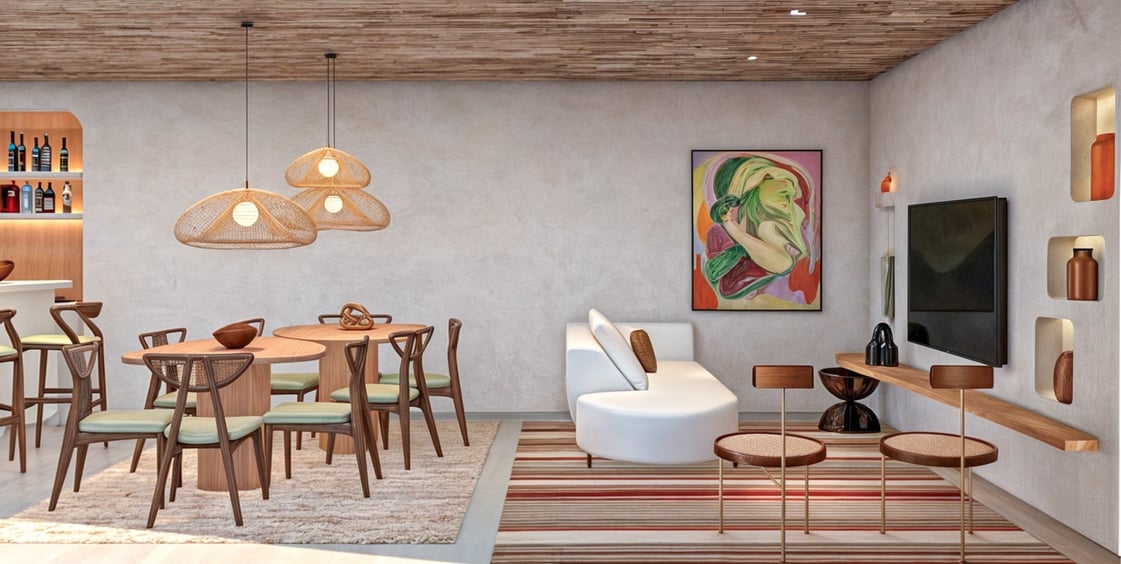 O Espaço de Festas nos fundos do quintal da Residência 624 era um desejo antigo da família, que adora receber amigos e familiares de outro estado. A bancada central possui duas alturas, ideal para servir os convidados e preparar drinks enquanto conversam. Ao lado, encontram-se duas mesas de jantar ao invés de uma única grande, permitindo ajustar o layout conforme eventos específicos. Os formatos orgânicos foram escolhidos para promover fluidez na circulação do ambiente. A parede com prateleiras de bebidas traz ladrilhos hidráulicos artesanais em terracota. Essa escolha criativa visa incorporar a brasilidade e o calor típicos da região nordestina, terra de origem da família.