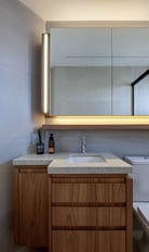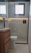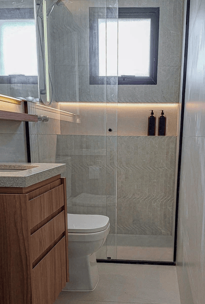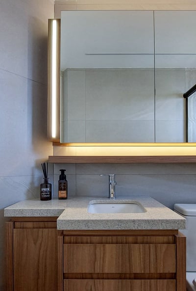 A reforma do banheiro, localizado entre os quartos e o corredor de um apartamento dos anos 90, incluiu a substituição dos revestimentos menores por formatos maiores, proporcionando uma sensação de amplitude. Foram introduzidas diferentes propostas de iluminação para atender a usos específicos. Com a instalação de um novo armário superior, o armário inferior pôde ser reduzido em profundidade, melhorando a circulação no ambiente. Nosso princípio na TeJota é reestruturar ambientes com foco em estética, ergonomia e funcionalidade