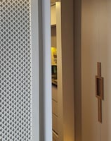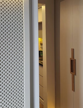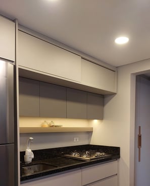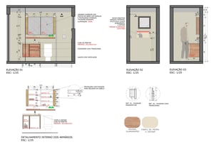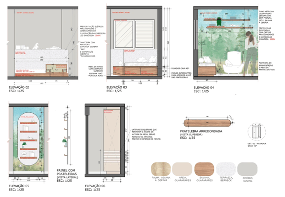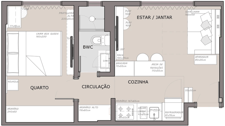 O imóvel foi adquirido como investimento para revenda rápida por compradores que atualmente residem fora do pais. Para valorizá-lo, os espaços foram otimizados com soluções de marcenaria eficientes. Na cozinha, por exemplo, os armários superiores têm duas profundidades, o rodapé inferior é uma gaveta para vassouras, e o armário lateral da geladeira não só delimita os ambientes, mas também serve como despensa de temperos. Um armário funcional e inteligente foi instalado na pequena circulação do stúdio para armazenar roupas de cama e banho. A iluminação inferior foi projetada para facilitar a circulação noturna entre ambientes. Painéis treliçados de MDF adicionam um toque criativo no quarto e na sala, mantendo cores e acabamentos neutros para facilitar a rápida venda do imóvel.