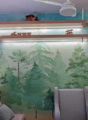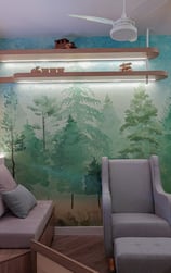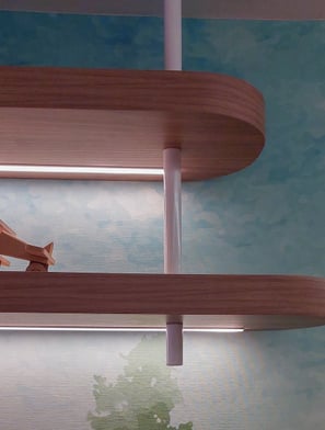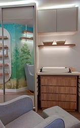 Este projeto foi concebido para o primeiro filho de um jovem casal que aprecia o estilo vintage. As cores claras das paredes e armários criam uma sensação de amplitude, complementada pelo espelho. O papel de parede exclusivo adiciona personalidade ao ambiente, inspirado na vegetação característica do Rio Grande do Sul, estado natal dos pais.