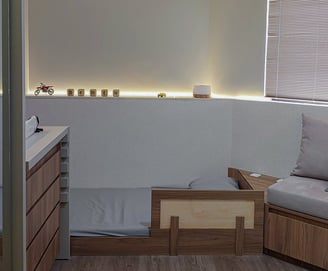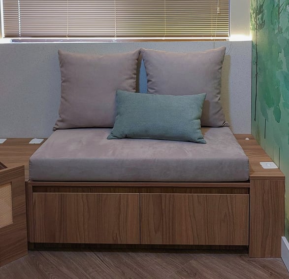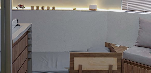 Um banco foi especialmente projetado para facilitar as primeiras fases da amamentação, permitindo que o pai ou as avós participem ativamente. No futuro, ele se tornará um espaço para criar memórias afetivas com a criança, seja através de brincadeiras, leituras ou na hora de dormir.