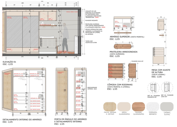 O trocador possui um tampo com altura regulável, transformando-se em uma mesa nos primeiros anos escolares da criança. A cômoda, equipada com rodinhas, pode ser facilmente reposicionada conforme o quarto acompanha o crescimento e desenvolvimento do seu ocupante. A utilização de palha indiana e MDF escuro evoca um ambiente rústico, reminiscente de tempos passados.